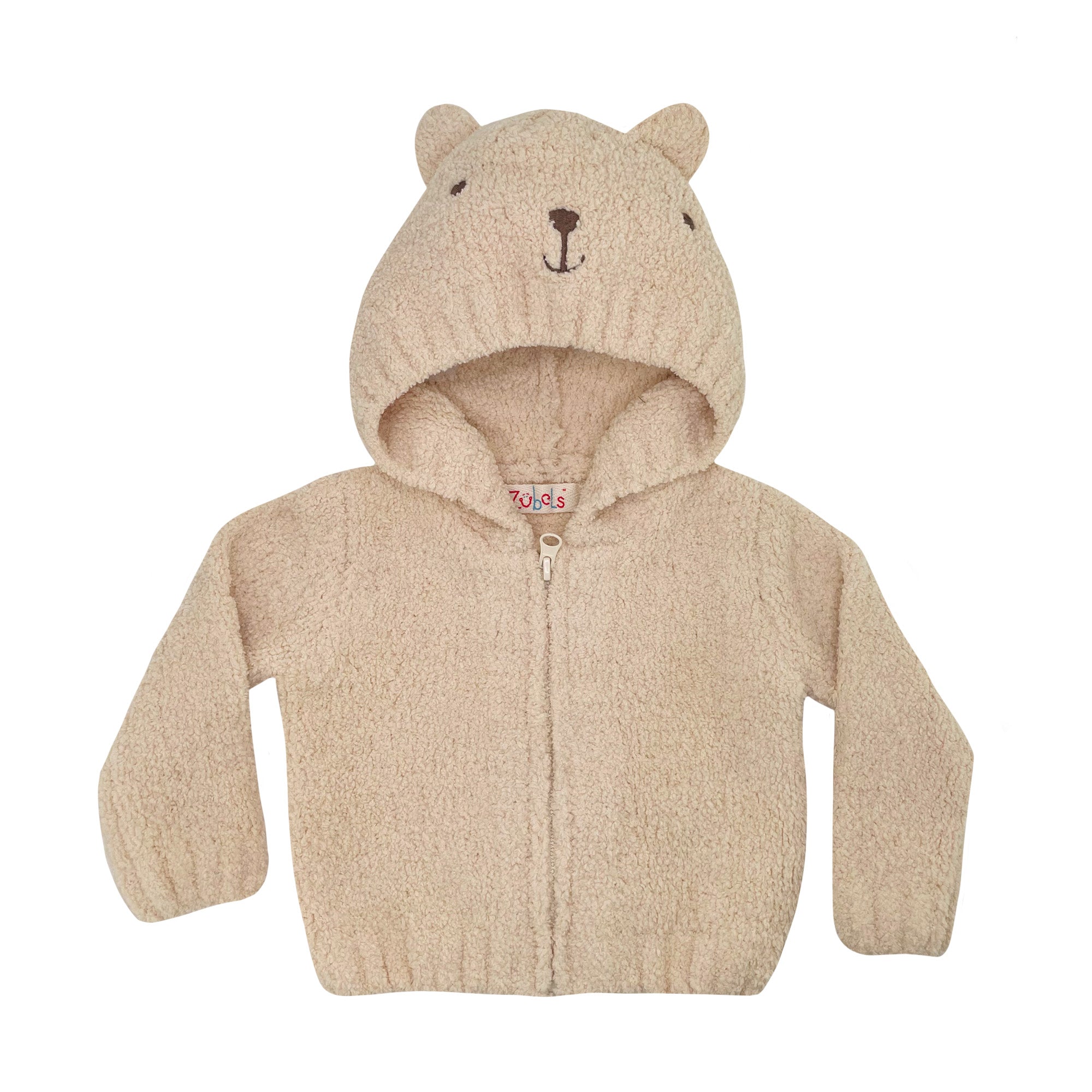 This playful hooded sweater comes in a zip up design with an embroidered bear face on the hood with 3-D ears. Hand made with super soft and gentle chenille yarn that is comfortable and perfect for snuggly days!
