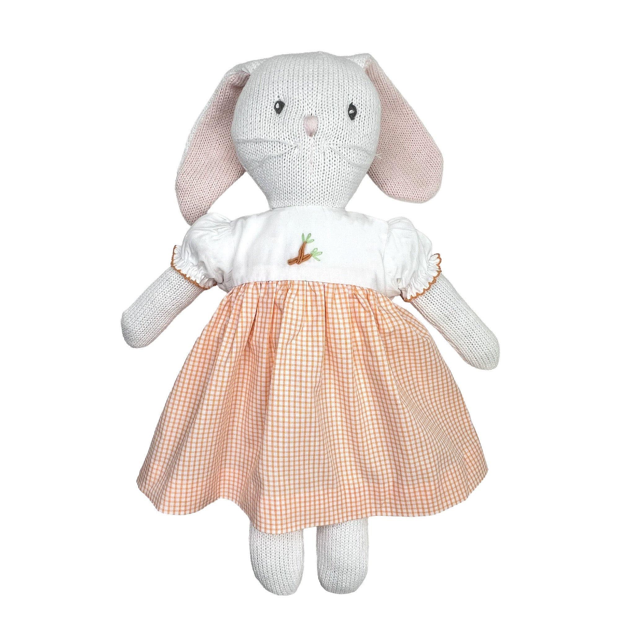 This hand-knit Easter bunny doll comes with an adorable short sleeve peach check dress with sweet embroidered carrot on the front.