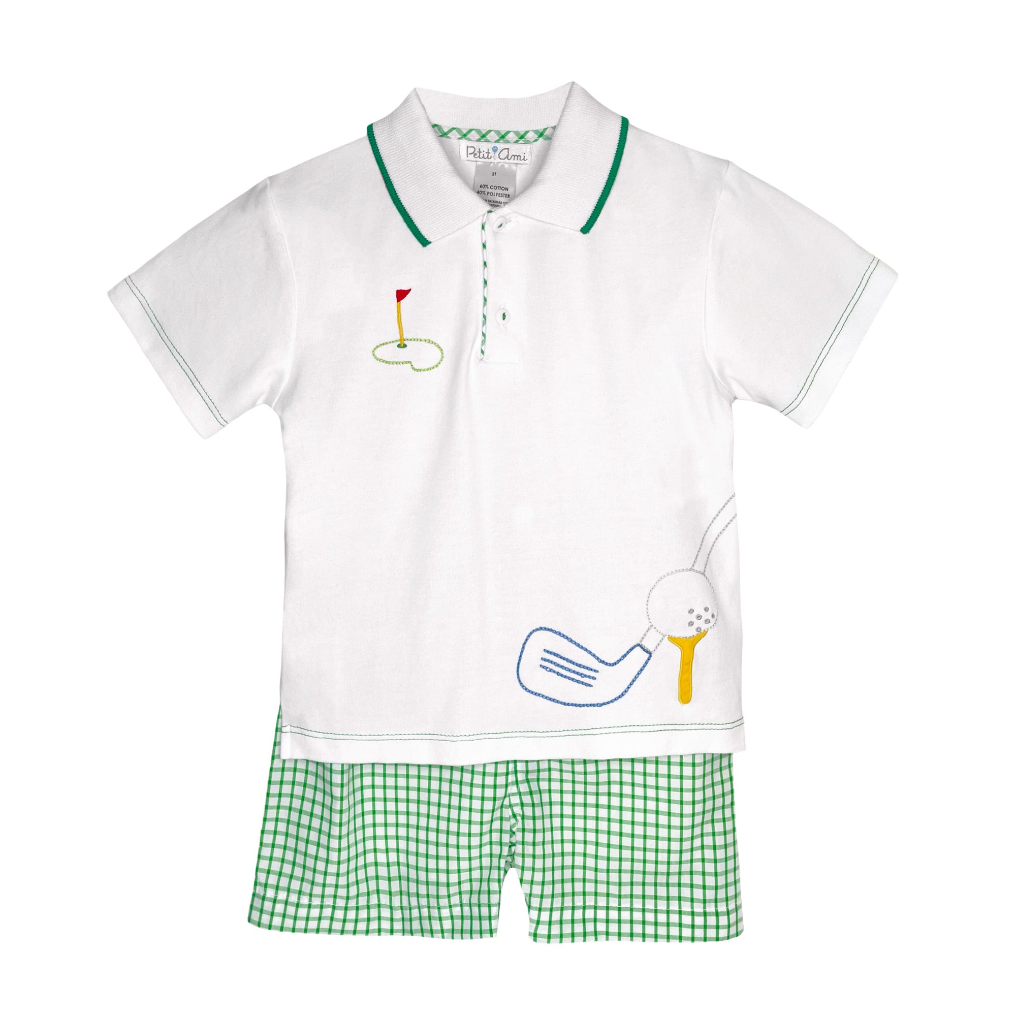 This set comes with a white cotton knit polo shirt with golf themed chain stitch embroidery and matching green and white check shorts.