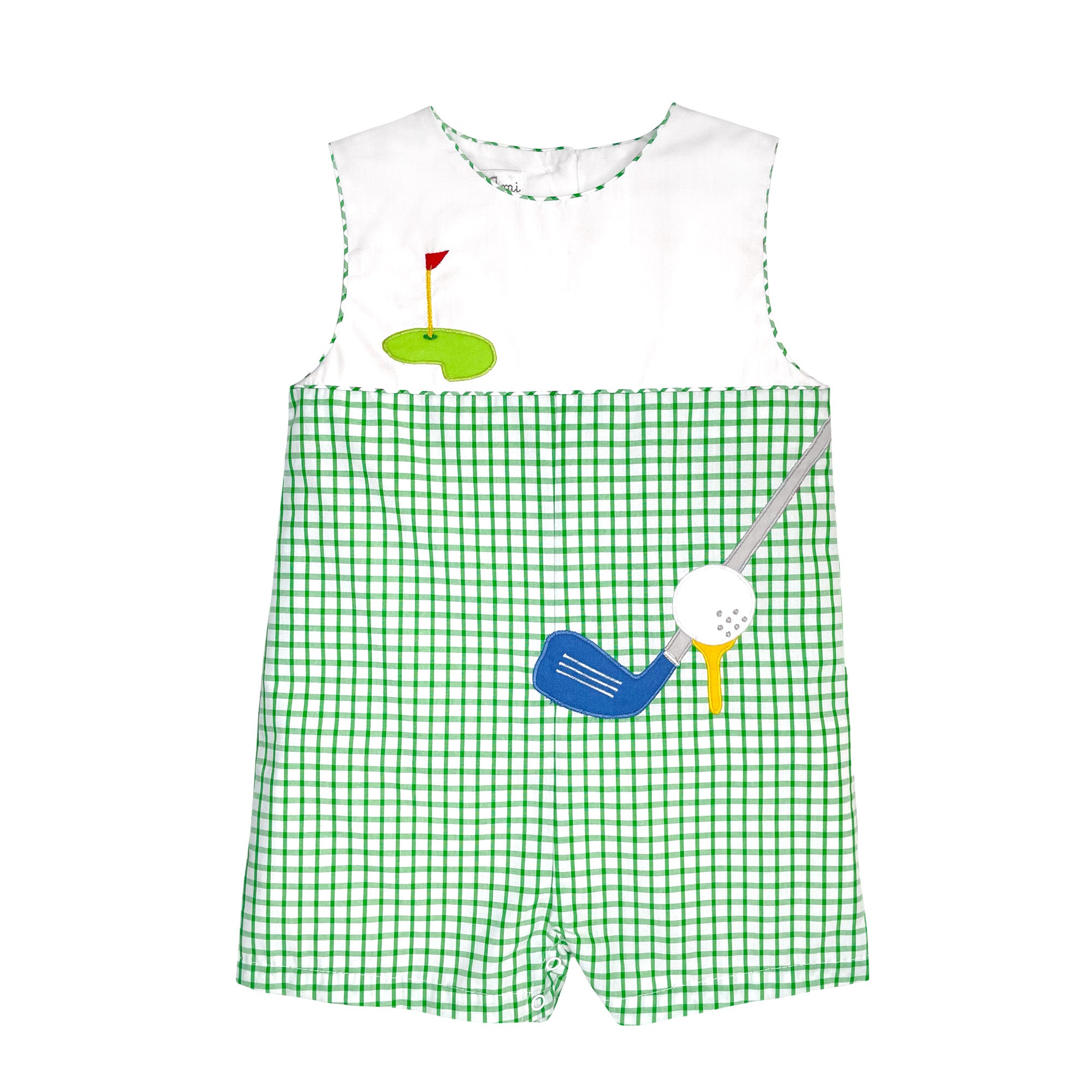 This sleeveless romper comes in a white and green check fabric with golf themed appliques on the front.